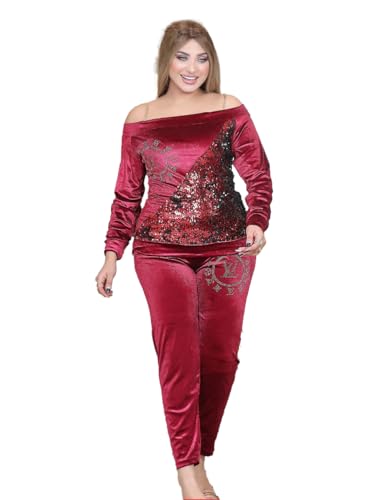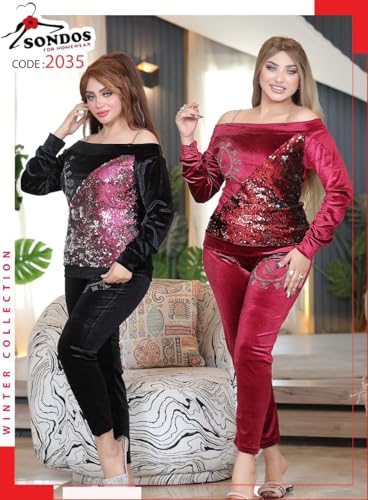 SONDOS FOR HOMEWEAR - طقم بيجامة قطيفة Sondos شتوي حريمي - 2 قطعة (توب وبنطلون) - قطيفة زبدة فرنسي فاخرة - ترتر قلاب ميتاليك - كتف مكشوف - مقاس حر (60-90 كجم) كود 2035
