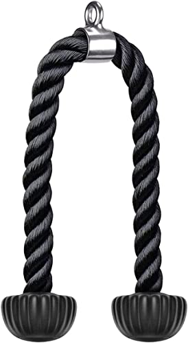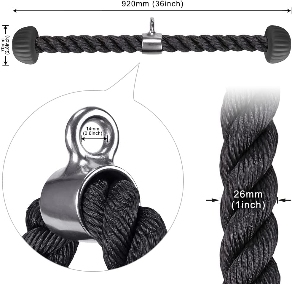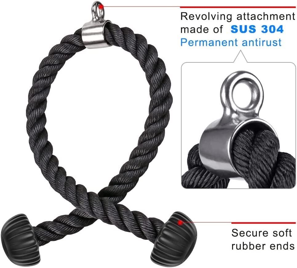 - HIGH QUALITY: Our rope is made of Heavy Nylon Rope which features excellent abrasion-resistance, high strength and long lasting performance which guarantees long-life utilization. The Revolving Attachment made of permanent antirust 304 Stainless Steel. Tricep Rope weight limited: 900 LB.