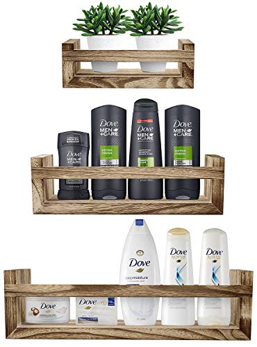 - STURDY DESIGN — Strong enough to hold your favorite small objects — Rustic distressed style shelf (with crossbar for extra security) — Made of 100% Solid Wood — Neutral color — Comes assembled and ready to hang — Set of 3 — Approximate measurements (LARGE) 16.2” L x 4.6” W x 4.5” H — (MEDIUM) 12.6” L x 4.2” W x 3.7” H — (SMALL) 8.7” L x 3.8” W x 2.9” H