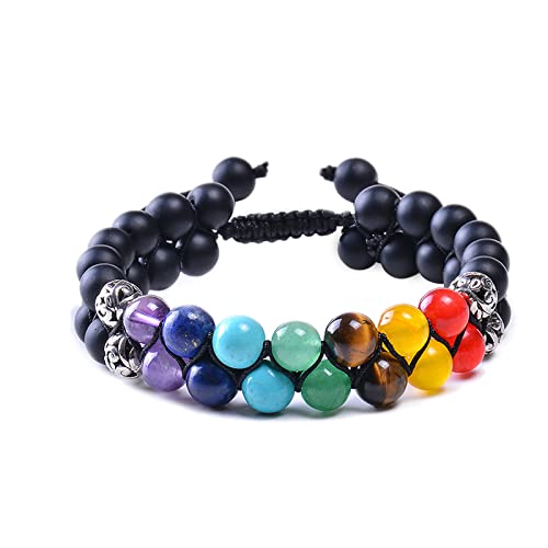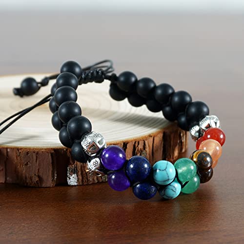 soulnioi - 7 Chakras Colorful Volcanic Stone Double Braided Bracelet Yoga Stone Beads Bracelets Meditation Relax Anxiety Bangle for Womens Mens