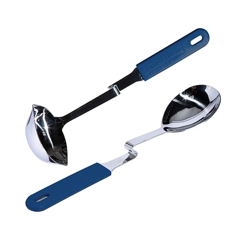 - CREATIVE DESIGN: Reduce messes in your kitchen and keep your ladle and spoon nearby. Our soup ladle and spoon set has a patented curved handle design that easily hangs in the rim of the pot, keeping your space organized and clean. No more spoons slipping down into the soup. No more spoon rest clutter or dirty counters.
