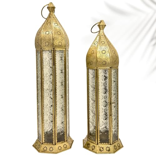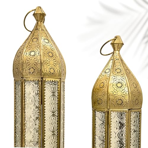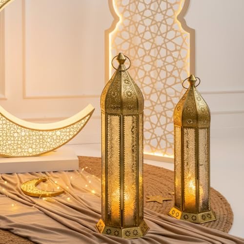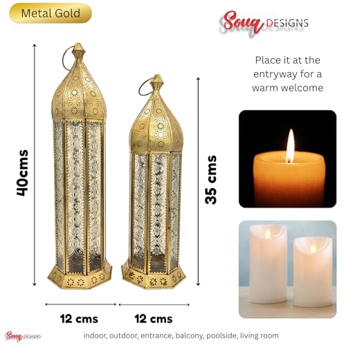 - Set of 2 Moroccan Inspired Lanterns – Beautifully designed in gold metal with frosted embossed glass, this hexa lantern set includes 2 sizes (40 cm & 35 cm). Perfect as Moroccan Ramadan lanterns, Eid decorations, and Arabic style candle holders.