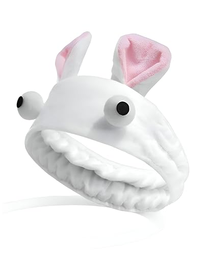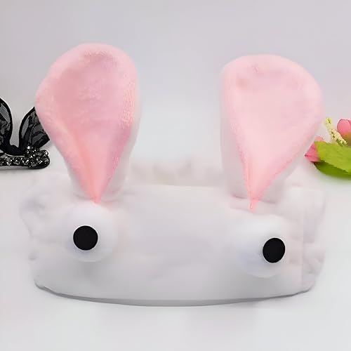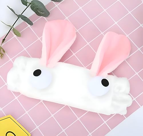 - Adorable bunny rabbit headband in white plush with pink inner ears and cute googly eyes, delivering a charming, whimsical touch to your skincare routine and spa moments.