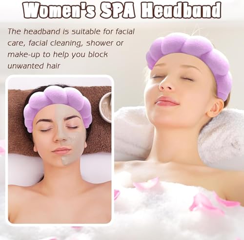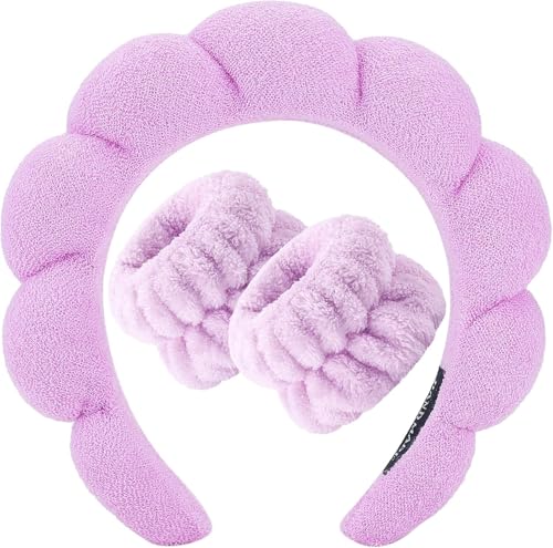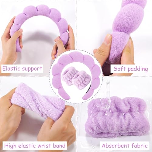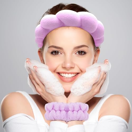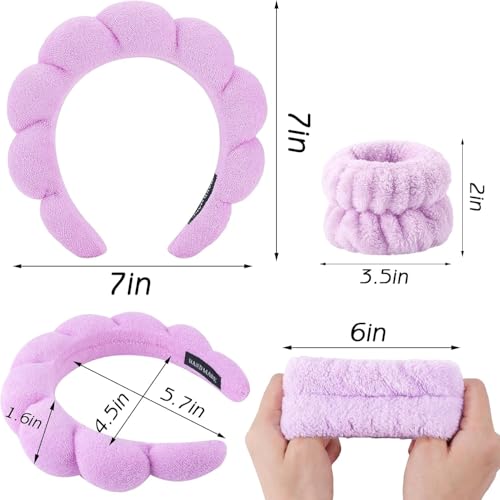 Generic - طوق رأس سبا مبطن ومنتفخ وغير قابل للانزلاق لغسل الوجه مع أساور معصم إسفنجية للعناية بالبشرة من قماش تيري ناعم بتصميم فقاعي للنساء والبنات، أكسسوار شعر سميك (أرجواني، قياسي)