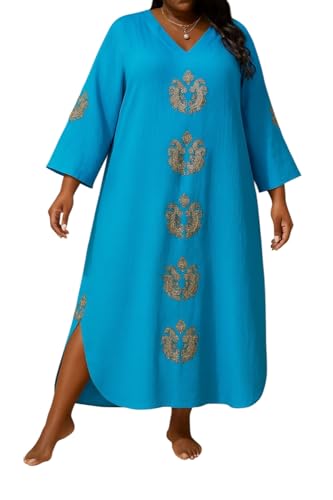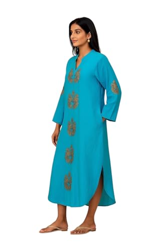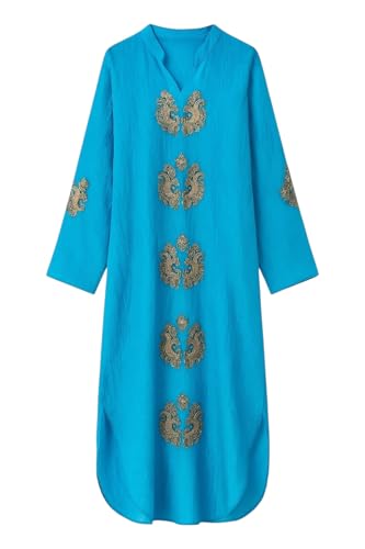 Generic - عباية كتان اسباني بتطريز ذهبي واكمام واسعة ورقبة على شكل حرف V، ازرق تركواز