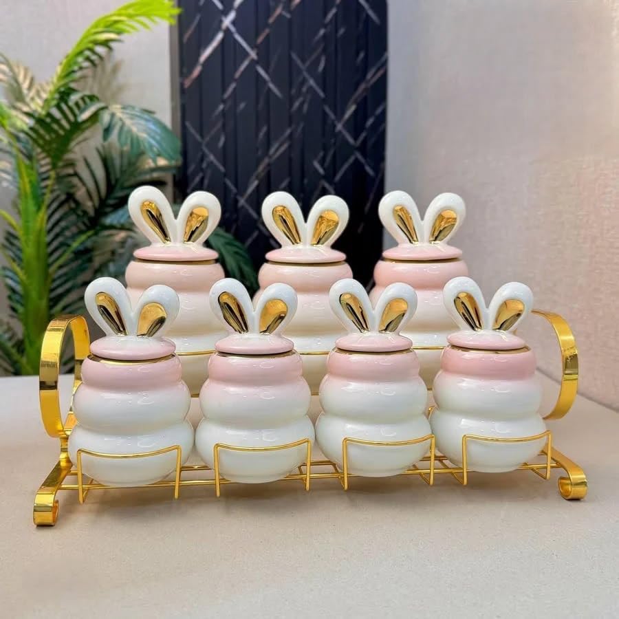 - COMPLETE SPICE SET: includes 7 pieces of spice cans in an adorable pink and white rabbit ear covers decorated with gold details
