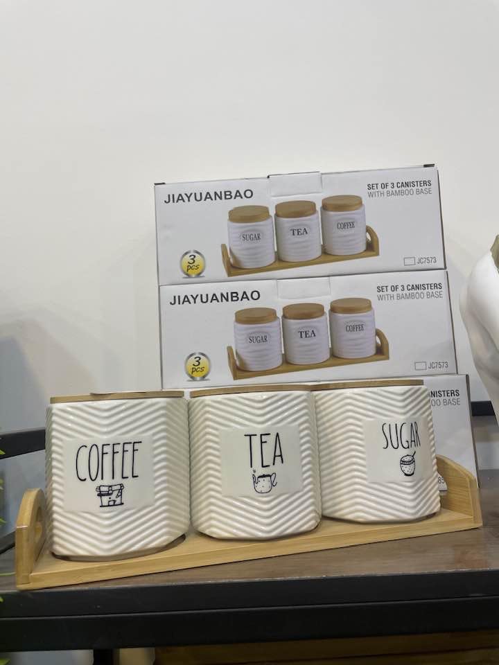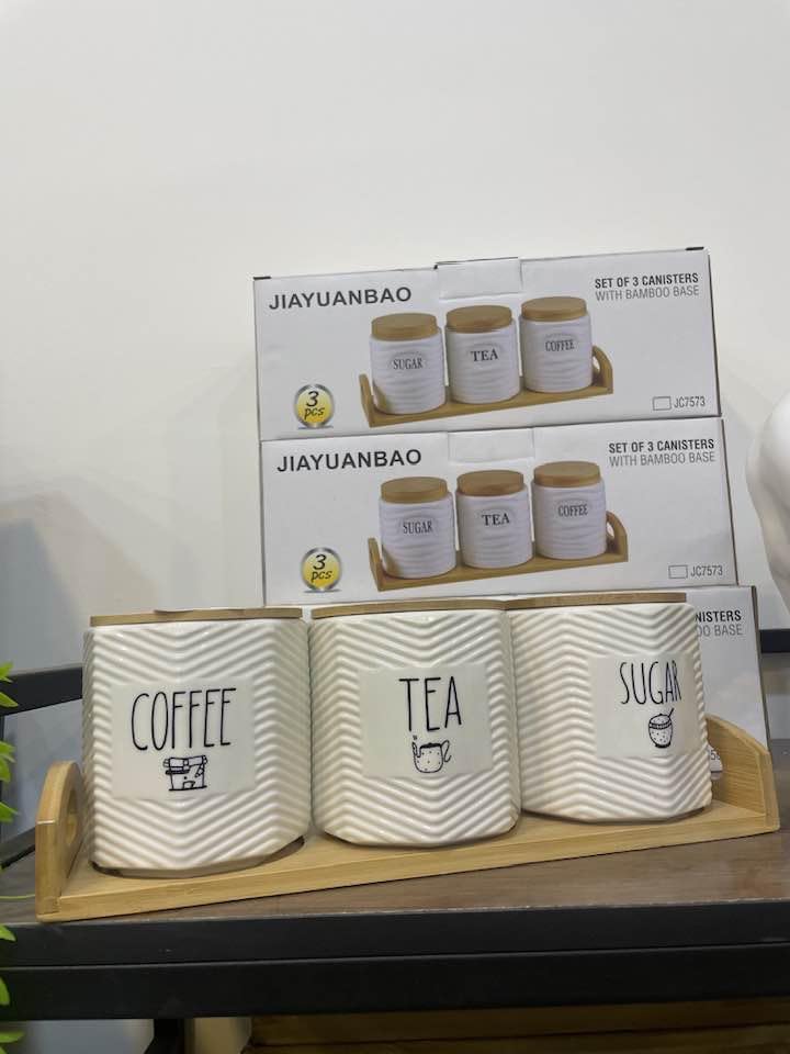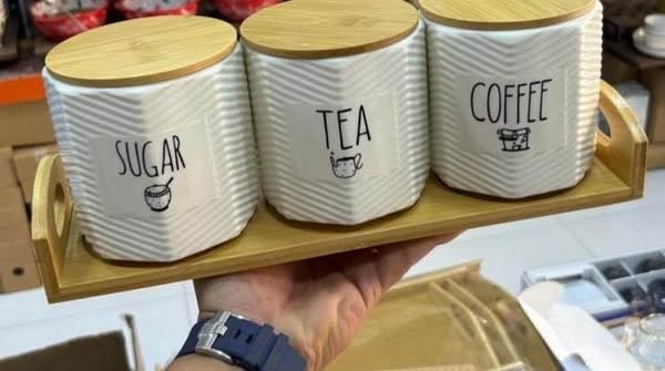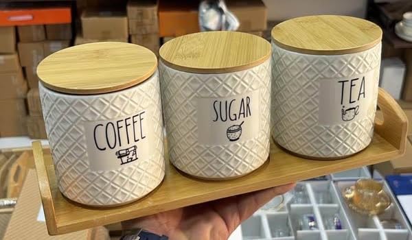 - Folder Set: Set of 3 Elegant Porcelain Containers for Coffee, Tea and Sugar with Wooden Base