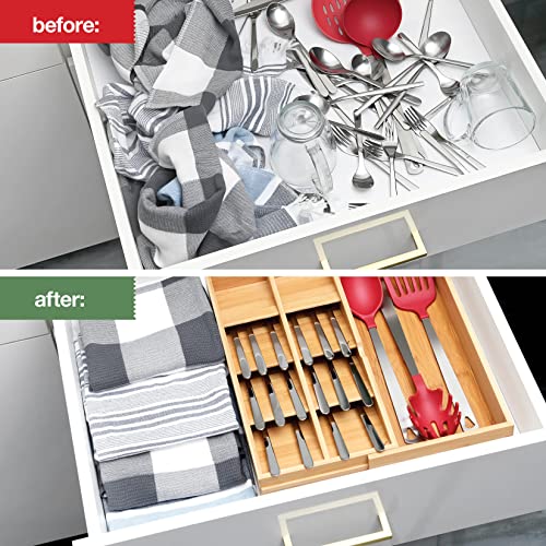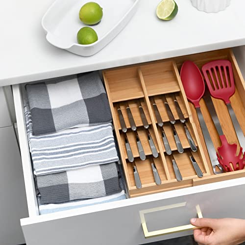 - THOUGHTFUL DESIGN! This kitchen utensil organizer is designed with 3 extra deep reinforced compartments and a wide 5.5" extensible section to store all of your essential kitchen utensils, The inner flaps were cleverly designed on a shallower angle to avoid silverware getting tangled in your drawer