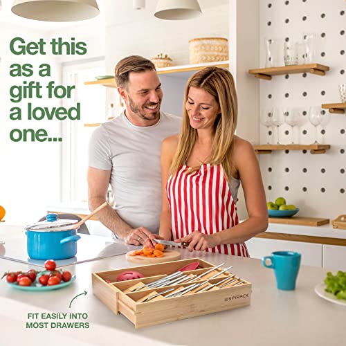 Spirack - Extendable Bamboo Silverware Organizer-Utensil Organizer for Kitchen Drawers, Cutlery Organizer in Drawer for Flatware and Utensil Storage with Anti-Slip Pads and Deep Compartments (4 Slot)