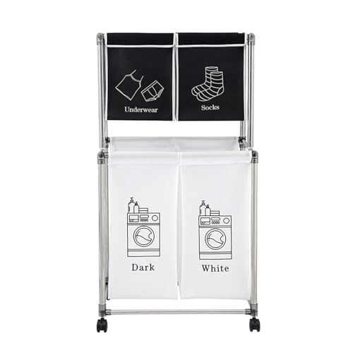 SPOFLYINN - Laundry Hamper 2 Tier Clothes Sorter With Four Wheels, 4 Removable Bags Laundry Bags For Bathroom Living Room Bedroom Laundry Basket, Light, Dark as show