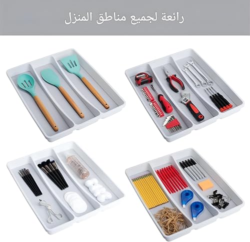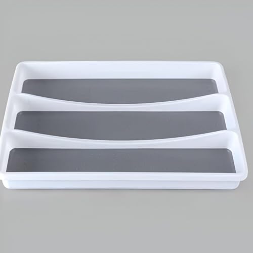 - The smartly designed drawer organizer features three spacious compartments, perfect for organizing large utensils like spoons and scoops in your kitchen drawers. Made of impact resistant plastic and silicone, ensuring durability while maintaining a neat look in your compartments.