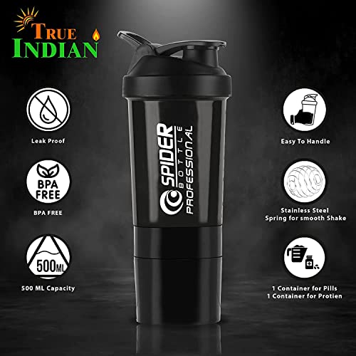 TRUE INDIAN - Sports Gym Shaker/Shaker Bottle/Protein Shaker Bottle/Gym Bottle/Water Bottle/Bottle/Shaker with Stainless Steel Blender Ball-500ml (Black) Set of 1