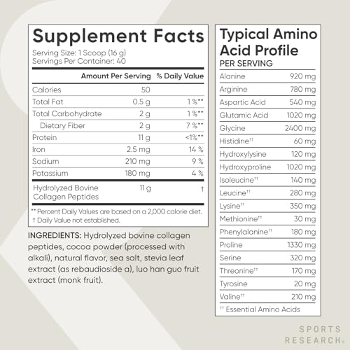 Sports Research - مسحوق كولاجين ببتيدات - كولاجين متحلل من النوعين 1 و3، مكمل بروتيني لصحة البشرة والأظافر والمفاصل - سهل الخلط مع العناصر الغذائية الحيوية والبروتينات والكولاجين للنساء والرجال من سبورتس ريسيرتش