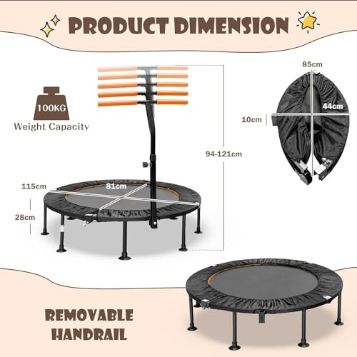 - ★HEIGHT ADJUSTABLE HANDLE★: The exercise trampoline features a foamed handle with 5 levels of adjustable height, allowing for customization based on the varying heights of individuals. As a result, it is not only ideal for children to enhance bone growth and athletic abilities but also suitable for adults seeking aerobic exercises.