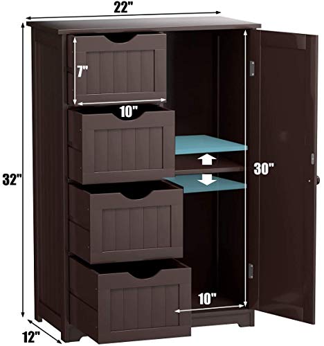 - Multi-purpose: Bathroom floor cabinet is perfect for keeping your bathroom clutter free, it features four deep drawers and a cupboard to conceal towels, toiletries and other essentials. You can also decorate the top of the unit with candles and other objects to add color and character to your bathroom.