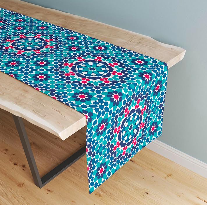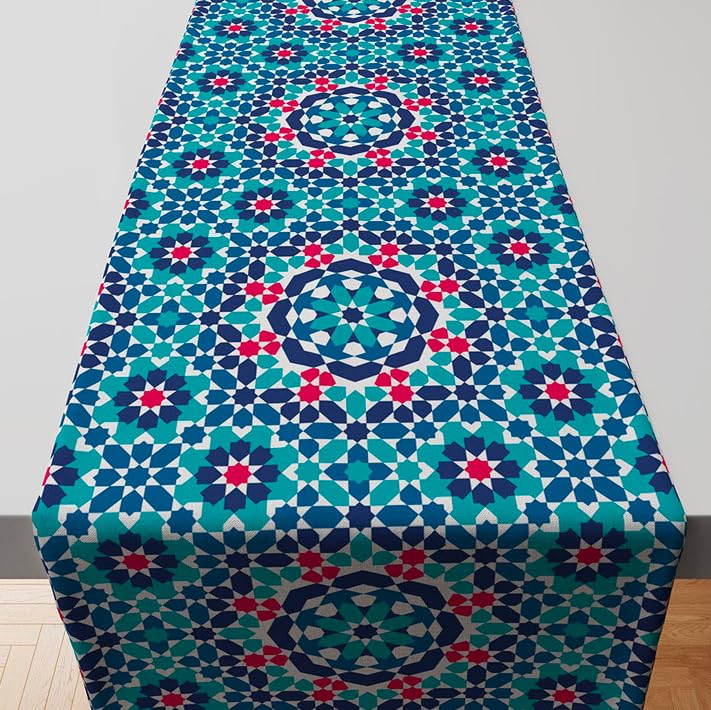 - Authentic Khayamiya Design: Handcrafted table runner featuring traditional Egyptian tent-making artistry with intricate Moroccan-inspired geometric patterns in vibrant turquoise, navy blue, and pink shades