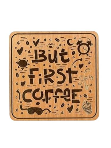 SIGN & DESINE - Square Wood Cup Coaster Engraved with a Coffee First Quote, Thickness 6mm, 9.5 x 9.5 x 0.6 cm - Havan
