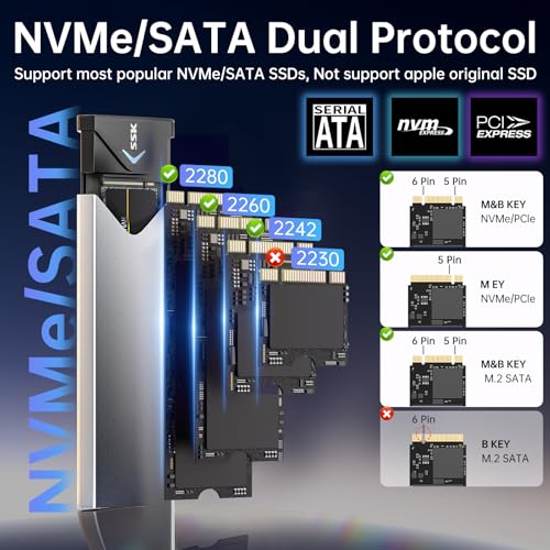 SSK - SSK Aluminum M.2 NVME SATA SSD Enclosure Adapter, USB 3.2 Gen 2 (10Gbps) to PCI-E NGFF M-Key/(B+M) Key External SSD Enclosure Support UASP Trim for SSD 2242/2260/2280