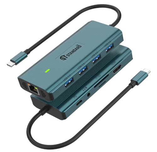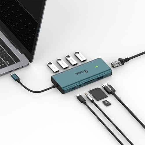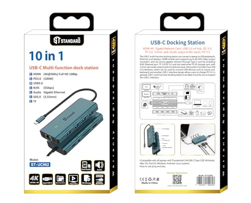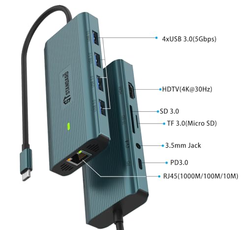 - 10-in-1 Multiport Docking Station – Expand a single USB-C port into HDMI 4K@30Hz, RJ45 Gigabit, 4×USB 3.0, SD/TF Card Reader, 3.5mm Audio Jack, and USB-C PD Charging.