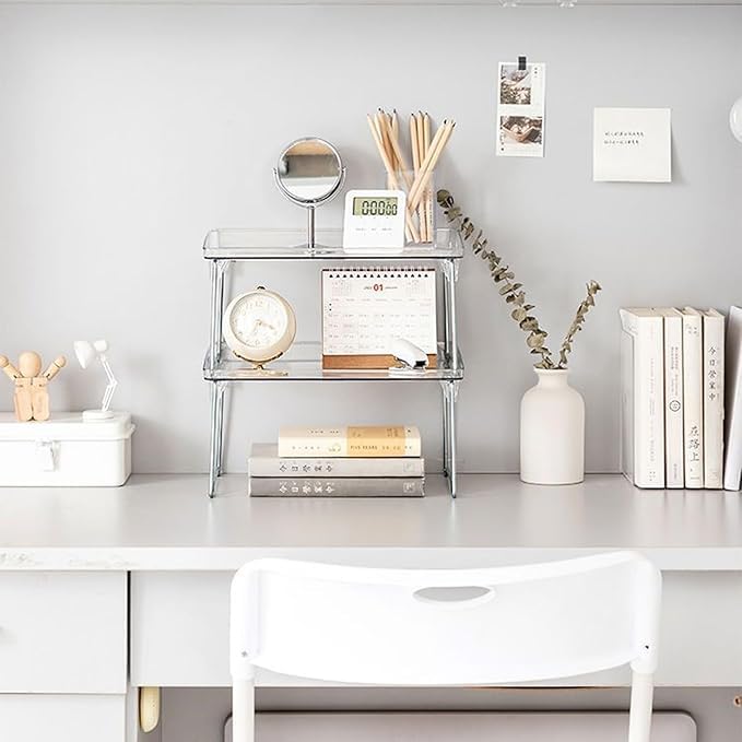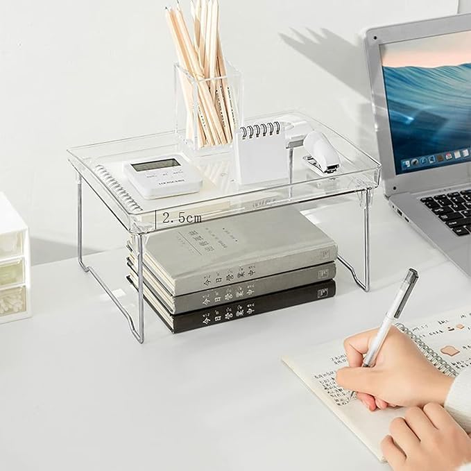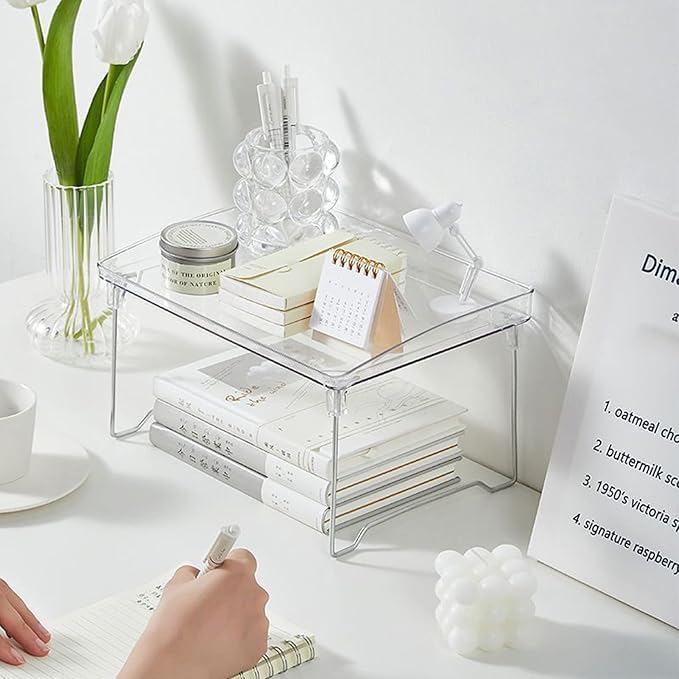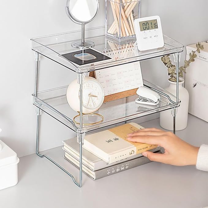 - MULTIPURPOSE USAGE: From kitchen utensils and cosmetics to stationery and bathroom supplies, our clear stackable shelf is designed to accommodate a variety of items. The -to solution for all your storage needs, in any setting