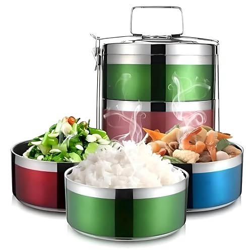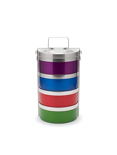 - Four-tier family food storage column with a vibrant acrylic exterior and a rust-resistant stainless interior, featuring an airtight lid to lock in freshness and deliver a stylish, contemporary look.
