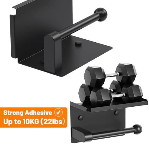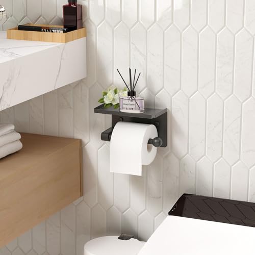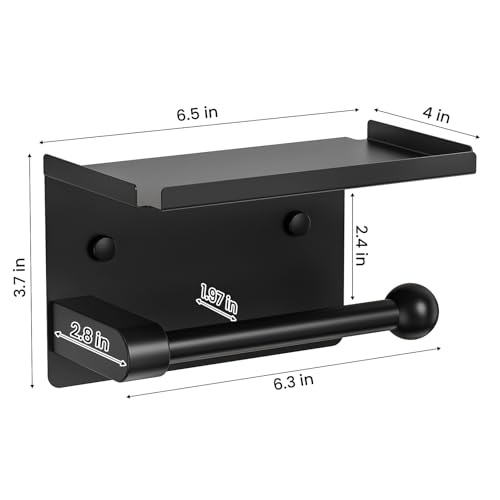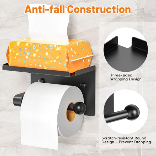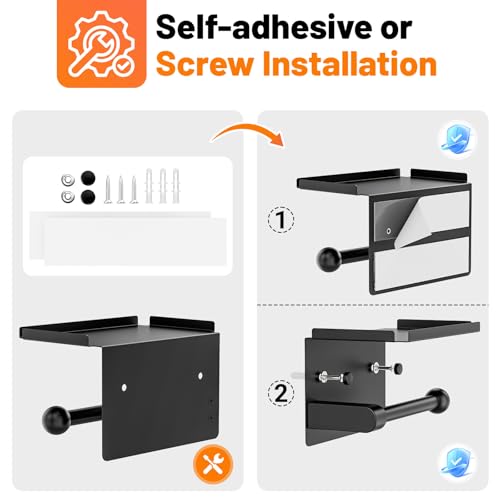 StackTastic - Metal Toilet Paper Holder with Shelf - Wall Mount, Rustproof, Adhesive & Screws Included, Toilet Tissue Roll Holder for Bathroom, Washroom Kitchen (Black)
