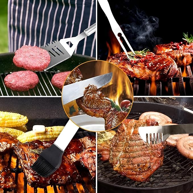 - طقم أدوات الشواء مصنوع من الفولاذ مقاوم للصدأ عالي الجودة، مما يوفر المتانة والاستخدام طويل الأمد. صممت كل أداة من الطقم المكون من 24 قطعة لتحمل الاستخدام المتكرر دون التعرض للصدأ أو الكسر، مما يمنحك أدوات موثوقة ستخدمك بشكل جيد على مر السنين بغض النظر عن عدد مرات الشواء.