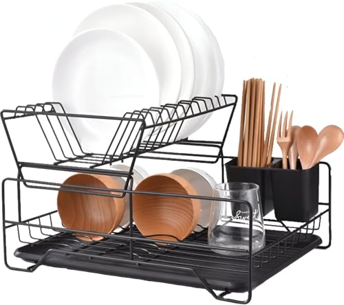 Generic - حامل غسالة صحون اسود من الستانلس ستيل بطبقتين، تصميم مطبخ متين يوضع على الرخام او الحوض، مجهز بلوح تصريف اسود للاستعمال مرة واحدة وسعة كبيرة