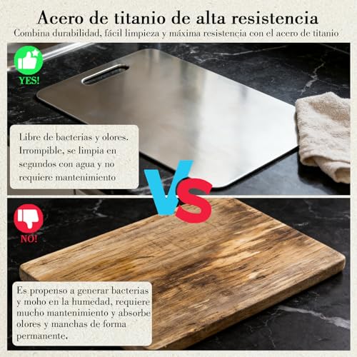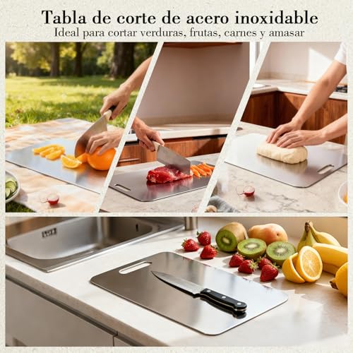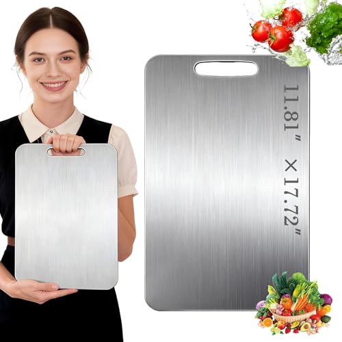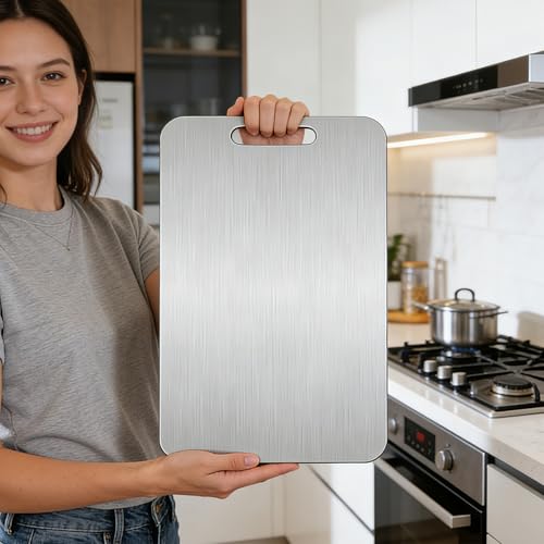 - 【Versatile Kitchen Usage】These kitchen chopping boards are not only for cutting meat, fish, vegetables or fruits, also great for rolling out dough, kneading bread or making sandwiches. Thanks to its strength, each stainless steel chopping board can withstand heavy tasks without warping, becoming the must-have multifunctional tool in any kitchen. The superior alternative to titanium chopping board for kitchen chopping board, with the durability of stainless steel for heavy use.