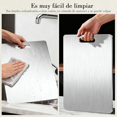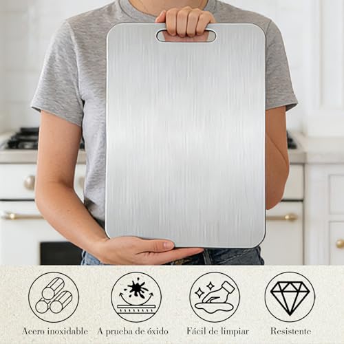 - 【EXTREME CLEANING IN SECONDS】Smooth non-porous surface resists stains and deep cuts. Clean it with water or place it in the dishwasher without worrying about deformation. Your stainless steel chopping board will always look flawless!