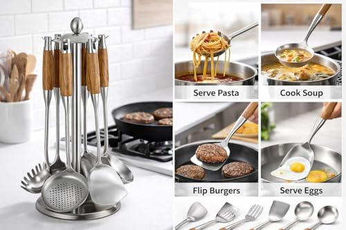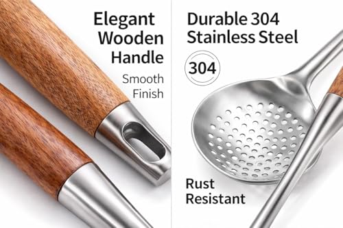 - 1. 6 Pieces Set – Complete kitchen utensils set for daily cooking needs. 2. Premium Stainless Steel – Rust resistant, durable, and long-lasting. 3. Wooden Handle Design – Comfortable grip and stylish look. 4. Easy to Clean – Smooth surface, سريع التنظيف ولا يحتفظ بالدهون. 5. Modern Stand Included – Keeps tools organized and saves space. 6. Multi-Use Tools – For soup, frying, serving, pasta & cooking.