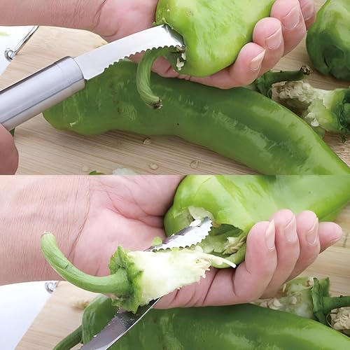 - Made from high-quality stainless steel, this chili core remover is durable, food-safe, and designed for long-lasting use, making it an essential kitchen tool for efficiently removing seeds from jalapenos, zucchinis, cucumbers, and other vegetables.