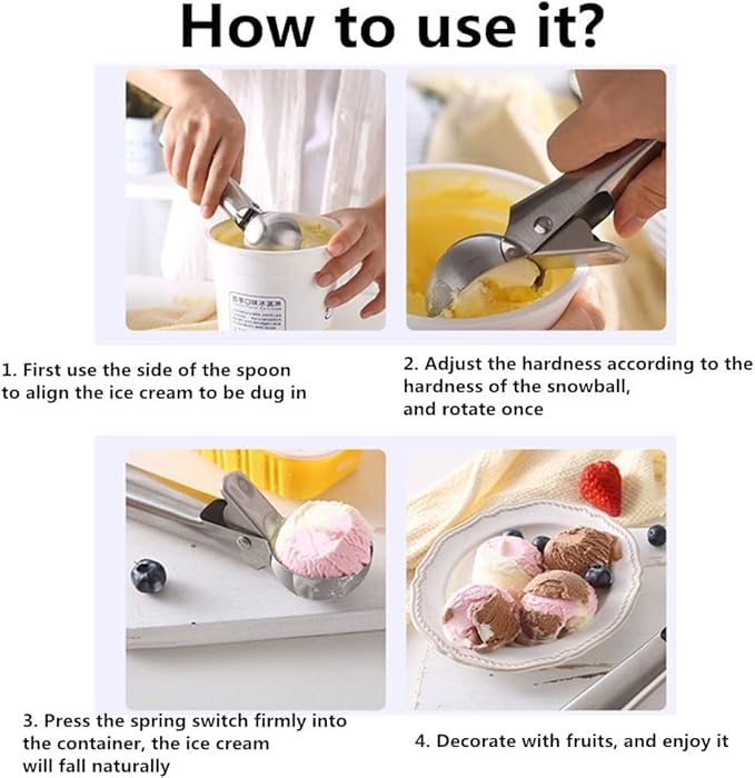 - 【Dishwasher safe】 The Ice Cream Scoop with Trigger is easy to clean. You can choose hand wash and dishwasher, both is safe. Please avoid harsh detergents. Just rinse the bowl of the scoop with clean water.