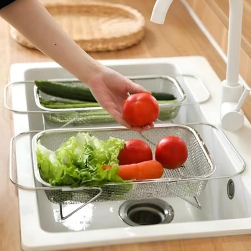 Generic - مصفاة حوض المطبخ وسلة فلتر من الستانلس ستيل، تصميم شبكي دقيق قابل للتوسيع لغسل الخضروات والفواكه وتجفيف الاطباق