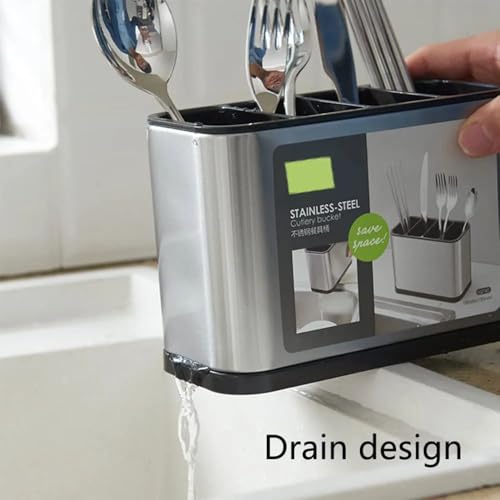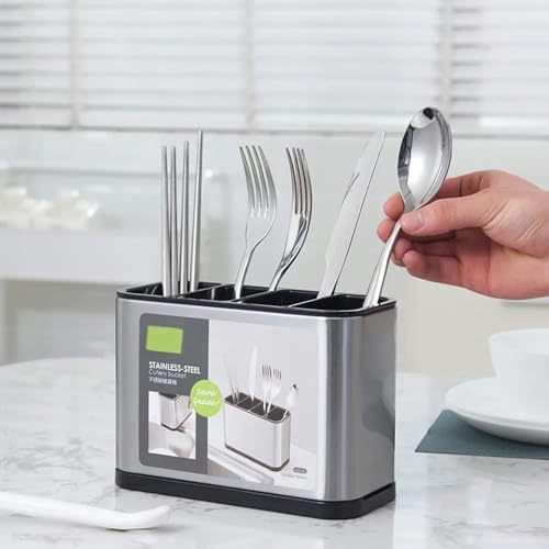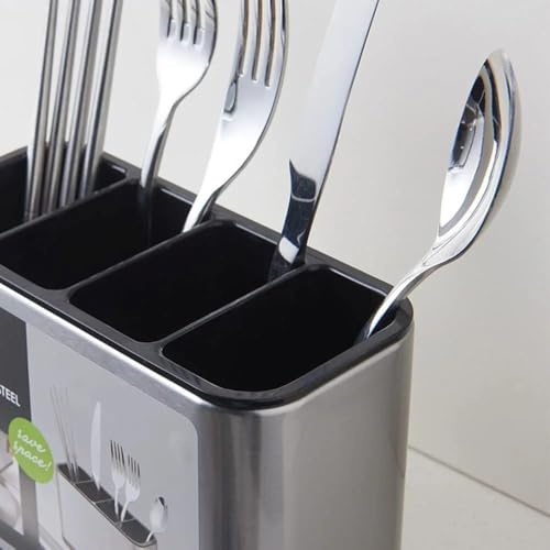 Generic - منظم ملاعق المطبخ من الفولاذ المقاوم للصدأ، ٤ خانات، حامل للملاعق والشوك والسكاكين، فضي وأسود