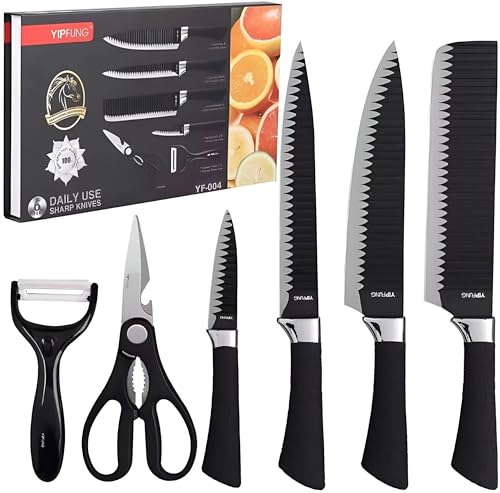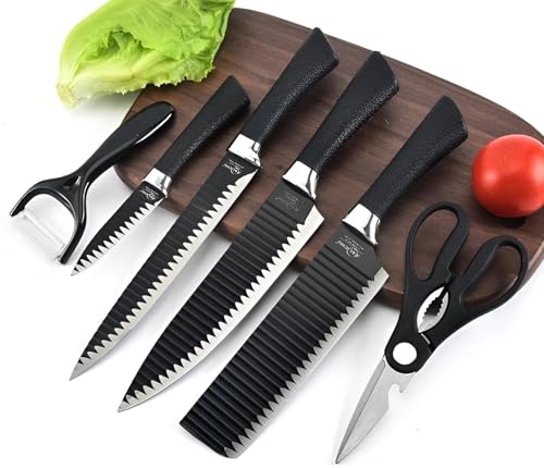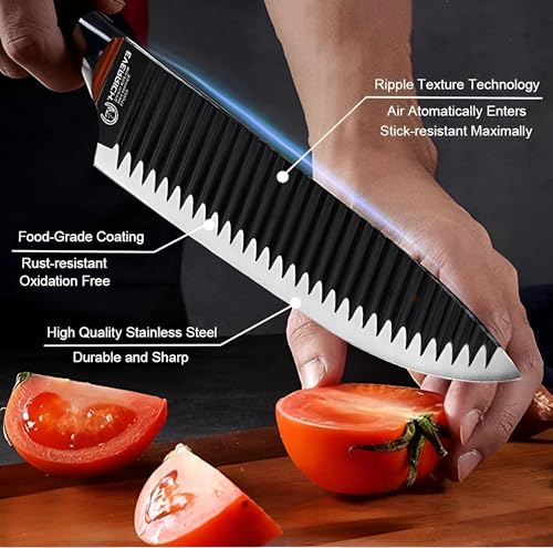 - This 6-piece professional knife set features innovative micro-serrated blade technology with a ripple texture design that naturally prevents food from sticking, allowing for smoother, cleaner cuts through meat, vegetables, fruits, and even frozen items without requiring excessive force.