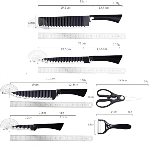 Generic - Stainless Steel Knife Set - 6-Piece Professional Culinary Kit with Serrated Edges, Black Grip Handles, Includes Chef, Cleaver, Carving, Paring, Peeler and Kitchen Scissors