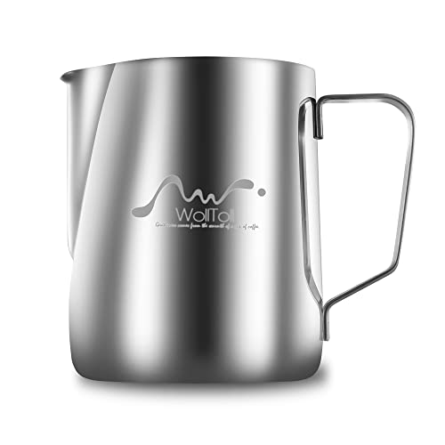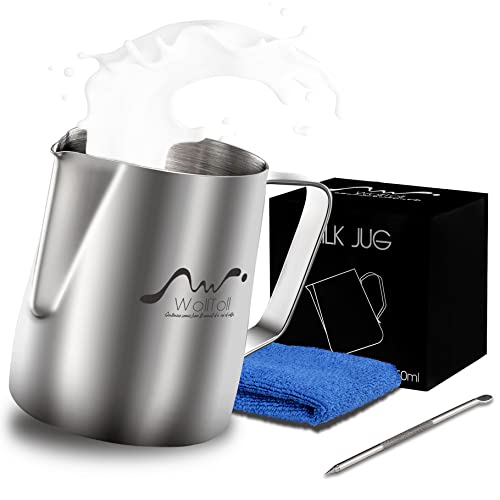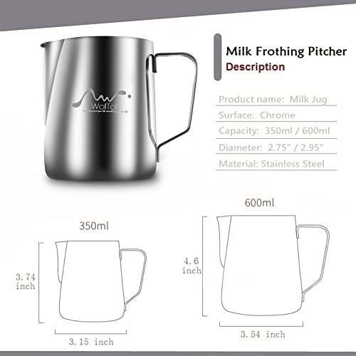 Wolltoll - Stainless Steel Milk Frothing Pitcher, 12oz/350ml Milk Coffee Cappuccino Latte Art Frothing Pitcher Barista Milk Jug Cup, Measurements on Both Sides Inside Decorating Art Pen & Microfiber Cloth