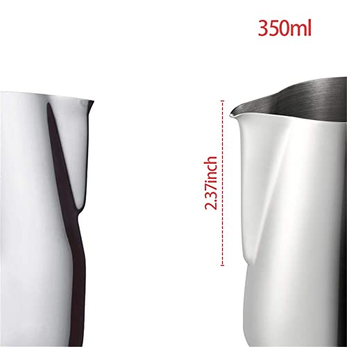 - CAPACITY & MEASUREMENT: This premium milk frothing pitcher is made of high grade stainless steel, never stains or rusts.Medium 12-ounce 350ml capacity that makes the milk pitcher perfect for 1 or 2 cup, great to use at home or office for you and a couple of friends. Measurements inside (oz/ ml) makes the milk jug easy to read and measure liquids. With heat-resistant and carefully-polished handle, the frothing pitcher cup is much safer and more comfortable to use.