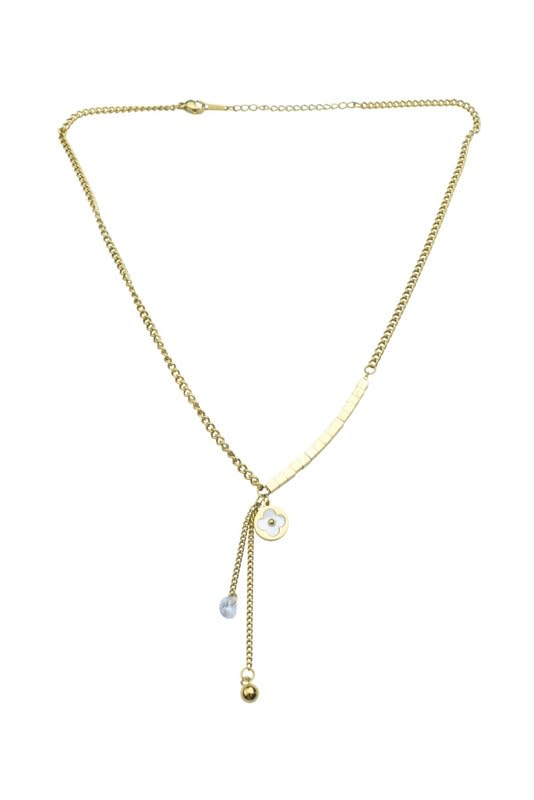 Generic - Stainless Steel Mixed-Chain Necklace with Flower & Bead Drop for Women - Gold