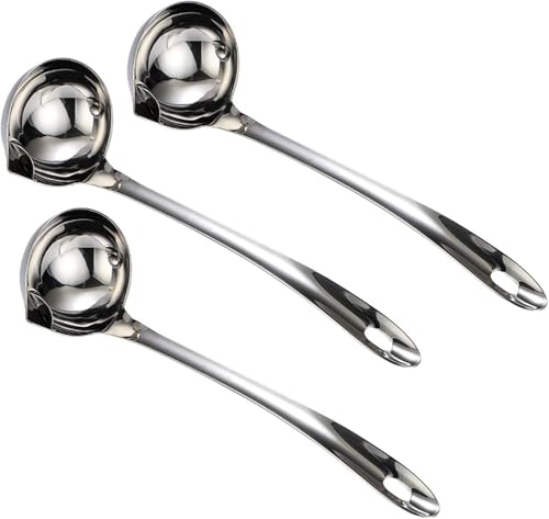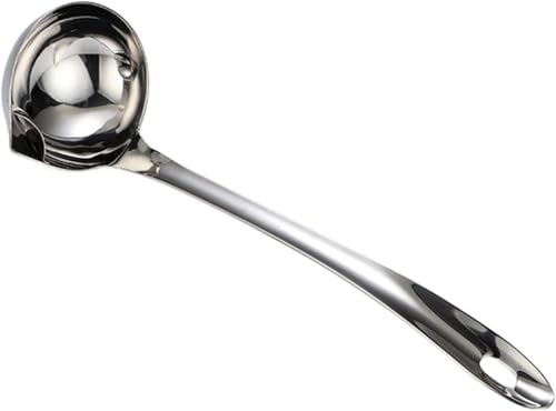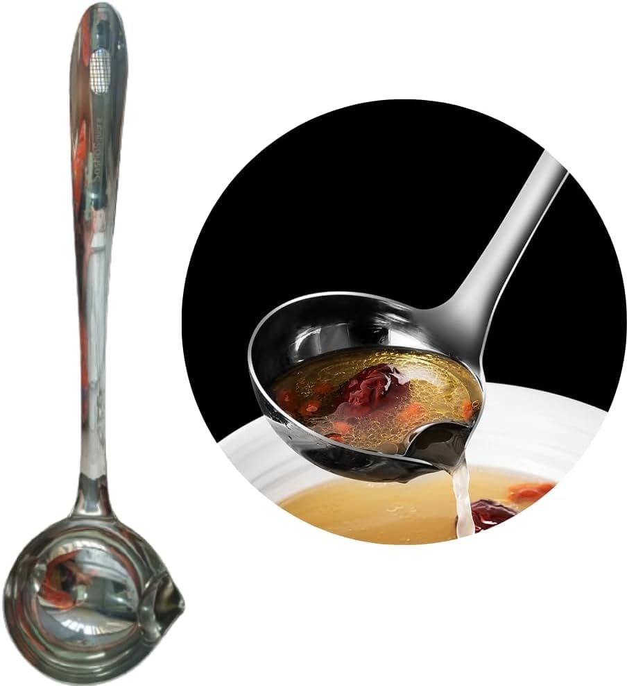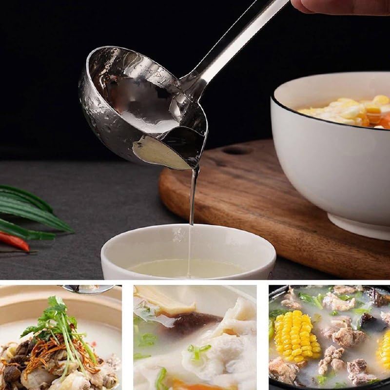 - MULTIPLE USES FOR ALL KITCHEN NEEDS: use to drain oil, meth, soup, and even pour sauces and hot drinks without spilling. It can also be used to serve foods neatly and professionally.