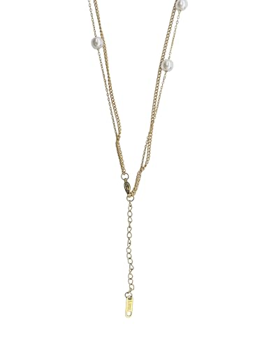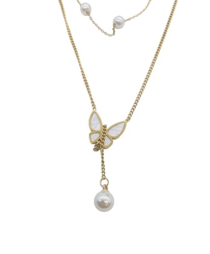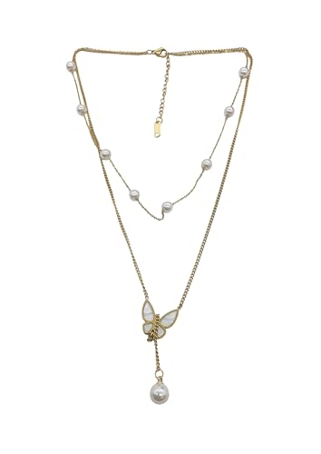 Generic - Stainless Steel Pearl Butterfly And Drop Pearl Necklace For Women - Gold