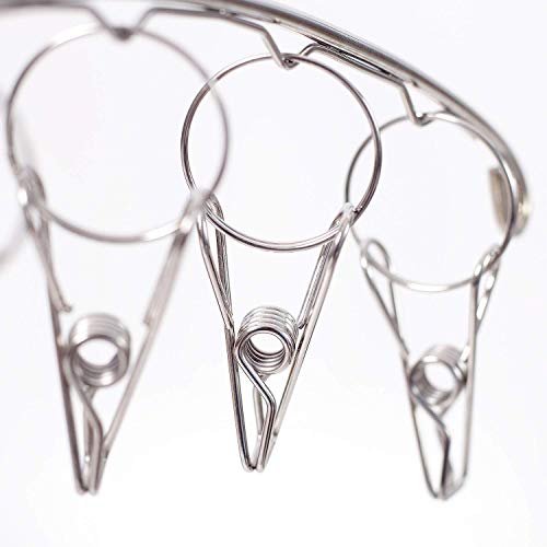 - A durable stainless steel clothes drying rack with 10 sturdy swivel clothespin clips for your drying needs.