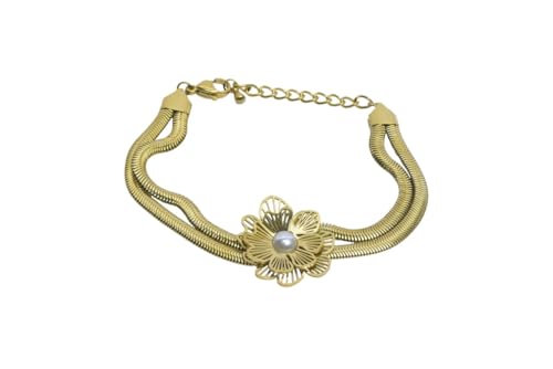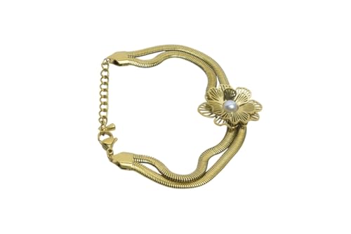 Generic - Stainless Steel Snake Chain Flower Bracelet with Pearl for Women - Gold