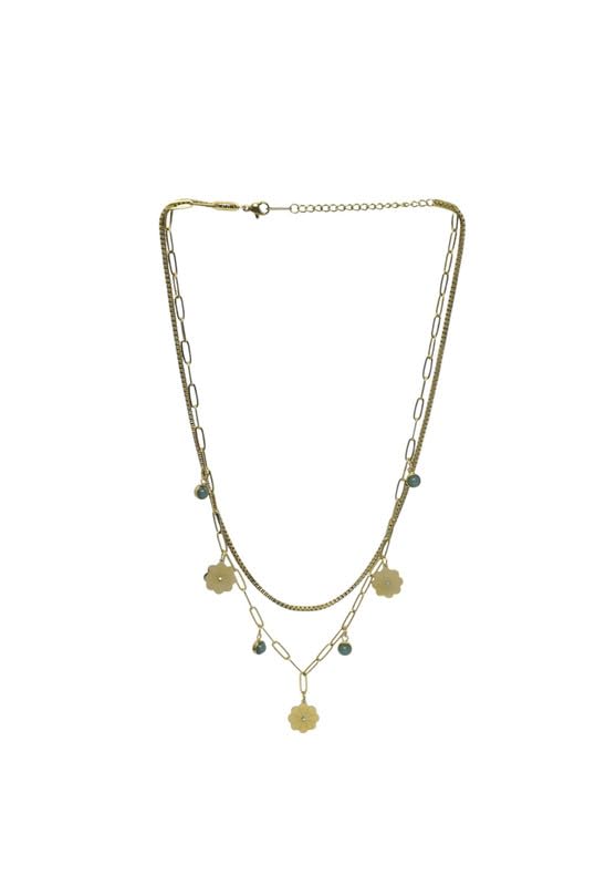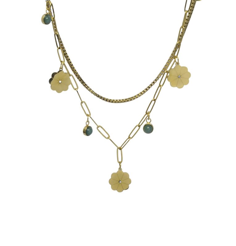 Generic - Stainless Steel Twins Necklace With Flower Design For Girl - Gold Green