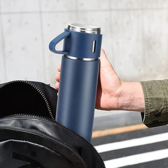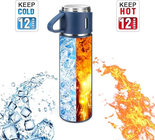 Generic - Stainless Steel Vacuum Flask 500 ml – Vacuum Insulated Travel Bottle with 3 Cups, Leakproof & Keeps Hot & Cold for 12h – Ideal for Hiking, Office, School, Outdoor (blue)