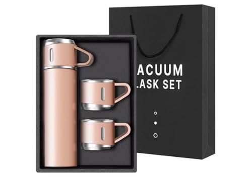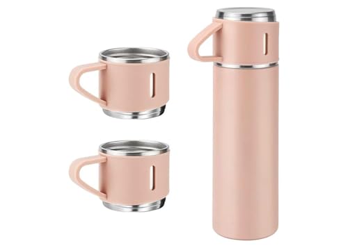 Generic - زجاجة معزولة بتفريغ الهواء من الستانلس ستيل، 500 مل، بينك، مع 3 أكواب للمشروبات الساخنة والباردة
