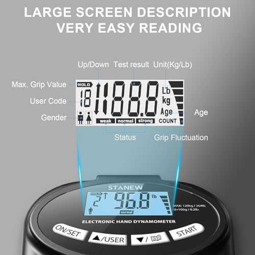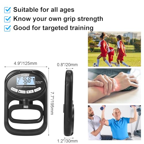 Stanew - STANEW Digital Hand Dynamometer, Digital Hand Grip Strength Trainer - Grip Strength Measurement Meter with HD LCD Display, Digital Grip Strength Exerciser for Sports, Home and School 265lbs / 120kg