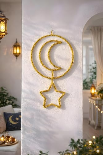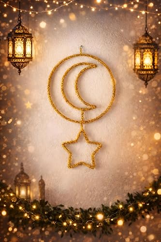 - تعرض زينة الزينة الذهبية الأنيقة هذه تصميمًا تقليديًا على شكل هلال ونجوم، متجذر بعمق في الرمزية الثقافية الإسلامية، مما يجعله خيارًا ذا مغزى ومحترم لشهر رمضان والعيد والاحتفالات الدينية الأخرى.