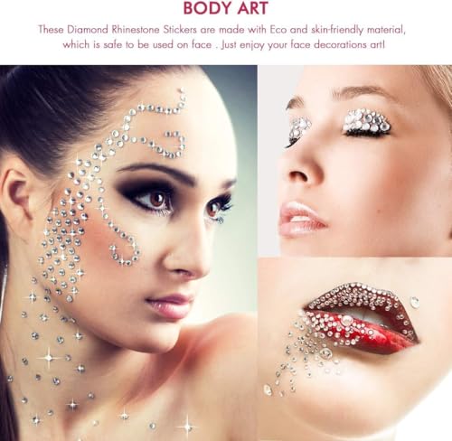 - QUALITY & MATERIAL: Made of rhinestone and acrylic diamond, fine gloss and durable to use. NOTE: This rhinestone face sticker includes small pieces, not suitable for kids under 3 to use alone.